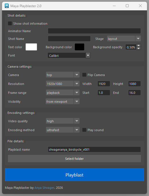 Maya Playblaster is a tool for playblasting in high resolution using h264 video codec on modern multicore CPU.